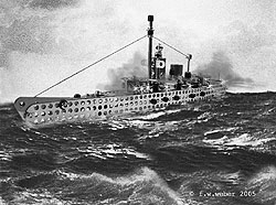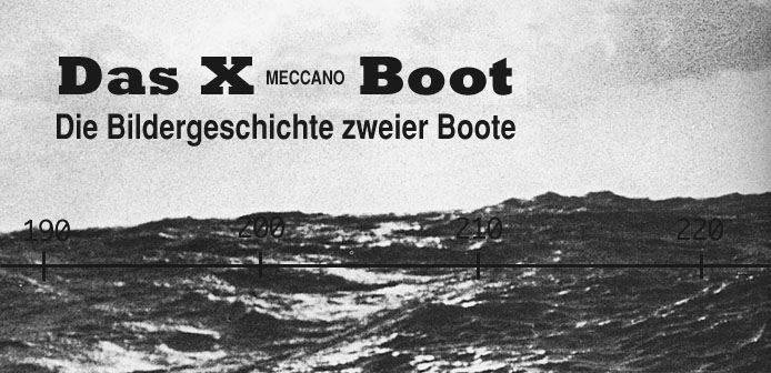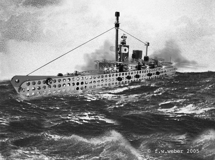Schweres Wetter im Atlantik. Im Ausguck die 1. Wache vom X-Meccano-Boot. Steuerbordausguck: "Ziel in 270!, vermutlich ein Kolcher" 1 WO: "Ziel bestätigt, von wegen Kolcher, ein schwerer Zerstörer der Meccano-Klasse! Kaleu auf Brücke!" Kaleu: "Endlich mal was los, seit Wochen kurven wir hier rum und nichts tut sich." |