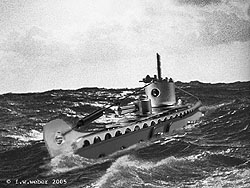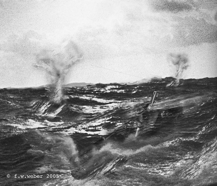 Bing...Bing...Bing... Funker: "Stetig lauter, direkt über uns." Kaleu: "Jetzt geht es an die Nerven, Wasserbomben!" ...Wummm..Wummm... LI: "Herr Kaleu, Schadensbericht, eines der Batteriedecks ist ausgefallen, Schleichfahrt nur noch maximal 20 Minuten möglich." Kaleu: "Tiefer auf 80." Bing...Bing...Bing... LI: "Vorne unten 10, hinten unten 5." ..Wummm..Wummm..Wummm... Kaleu: "Der ist hartnäckig, verzeiht uns wohl Rohr 2 nicht? Ruhe im Schiff!!" LI: "Schadensbericht, Treffer am Hauptruder, klemmt, Batteriedeck 1 ausgefallen, 2 ist lau, Antriebswelle backbords klemmt." Funker: "Keine Peilung, Ausfall Technik!" Kaleu: "So schnell bekommt der uns nicht.....Das Ende bleibt offen. |