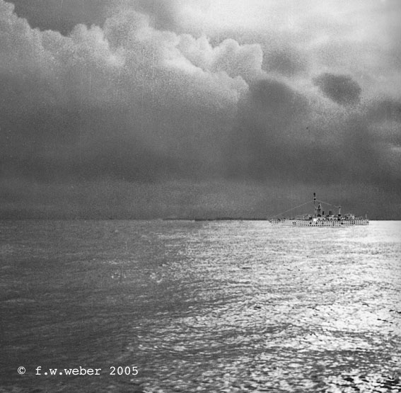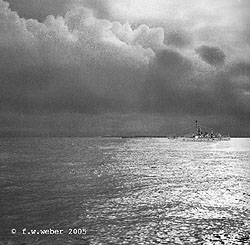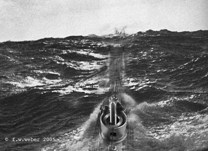 Kaleu: "Entfernungsmesser aufstecken, Ausguck in alle Richtungen fortsetzen. Auf Flieger achten! Scheint ein fetter Bursche zu sein, steht prima an der Kimm. LI, Diesel Fahrstufe eins, Boot ruhig halten! LI: "Wenn das mal geht bei der See, vorne fünf hinten fünf, Boot ausgetrimmt!" Piepels im Boot: "Was ist los da oben?" LI: "Der Alte hat eine fetten Brocken an der Kimm." Kaleu: "Scheint völlig allein zu operieren! Wenn das mal nicht eine Falle ist? Kein Geleitzug, kein anderes Schiff. Der fährt so langsam, daß man glaubt er wartet nur auf uns!" |