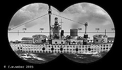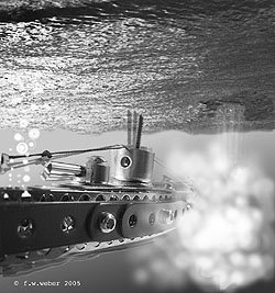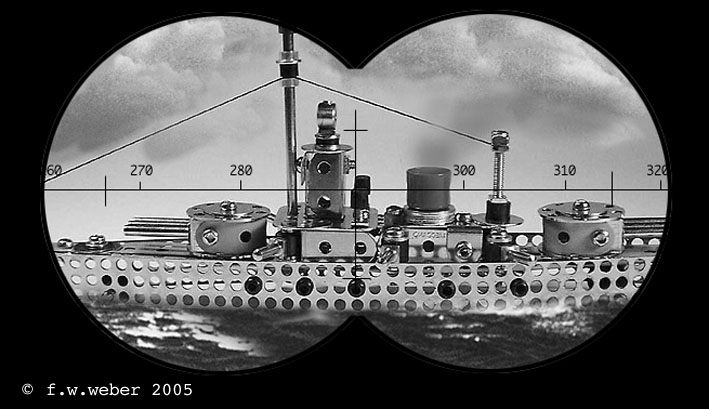 Kaleu: "Ziel in 290! Bestätigung, schwerer Zerstörer der Meccano-Klasse! Bis zu den Zähnen bewaffnet. Zwei 20 cm Drillinge und jede Menge zusätzliche Rohre. Brückenposten, Tiefenruder besetzen, auf Gefechtsposition, alles von Brücke außer 1 WO!" 2 WO: "AAAlaaaarm, alles auf Gefechtsposition, schneller, schneller, schneller..." |