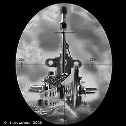 Funker: "Stetig lauter, Peilung ungenau auf allen Richtungen! Muß direkt auf uns zu laufen." Kaleu: "LI, Sehrohrtiefe halten, ich habe keine Kimm im Sehrohr. Verdammt wo steckt der denn, hat der sich verkrümelt?" Funker: "Saubere Peilung auf 260, extrem laut!" Kaleu: "265 - Alaaaarm Torpedorohre dicht, auf Tiefe gehen, LI Meldung!" LI: "Batteriedecks i.O. und voll, Diesel aus, Rohre 3 und 4 sind dicht, Tiefe 30!" Kaleu: "Auf 50 gehen, rot 20. Wäre doch gelacht, wenn wir dem nicht einen Haken schlagen. LI, Schleichfahrt und Ruhe im Schiff!" |